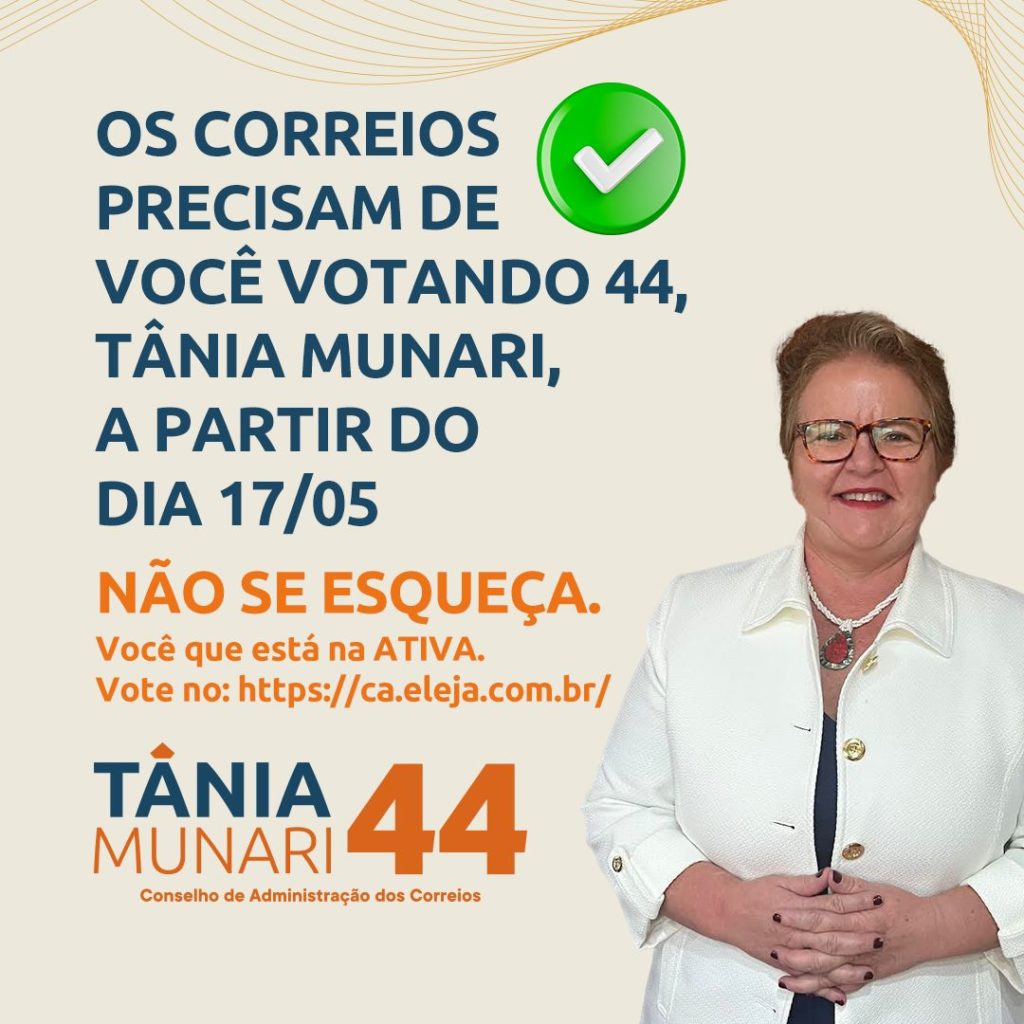 Você quer fazer a diferença no Conselho de Administração? Então participe votando em Tânia Munari – 44. Juntos, podemos construir uma empresa mais eficiente, mais justa e mais unida.