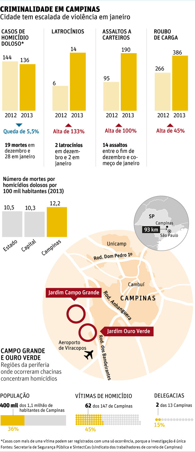 Em 2013, houve mais homicídios por 100 mil habitantes em Campinas do que na capital e no Estado. O número deste mês, 28 até agora, mais que dobrou em relação a janeiro do ano passado (13).