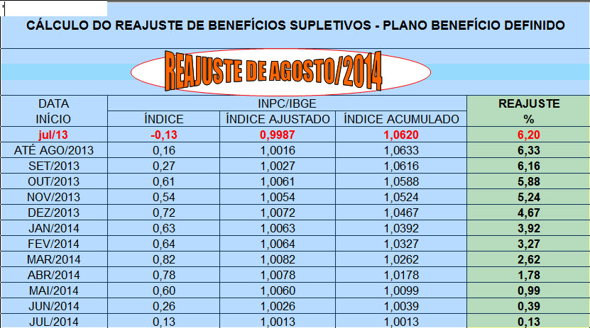 Este reajuste anual ocorre com a aplicação do Índice Nacional de Preços ao Consumidor – INPC, divulgado pelo Instituto Brasileiro de Geografia e Estatística – IBGE, acumulado desde o último reajustamento ocorrido em agosto de 2013. Tal procedimento está baseado no Art. 98 do Regulamento do Plano BD.