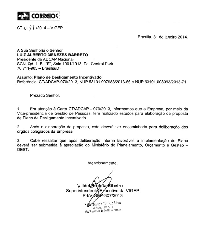 Carta enviada ao Presidente dos Correios dia 19 de novembro de 2013.