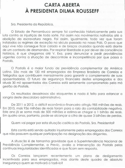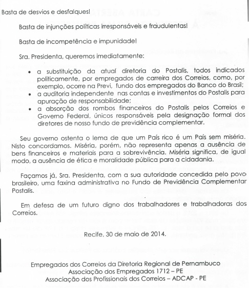 2. Leitura da Carta Aberta à Presidente Dilma. (essa carta também foi distribuída aos empregados dos Correios e a cidadãos pernambucanos).