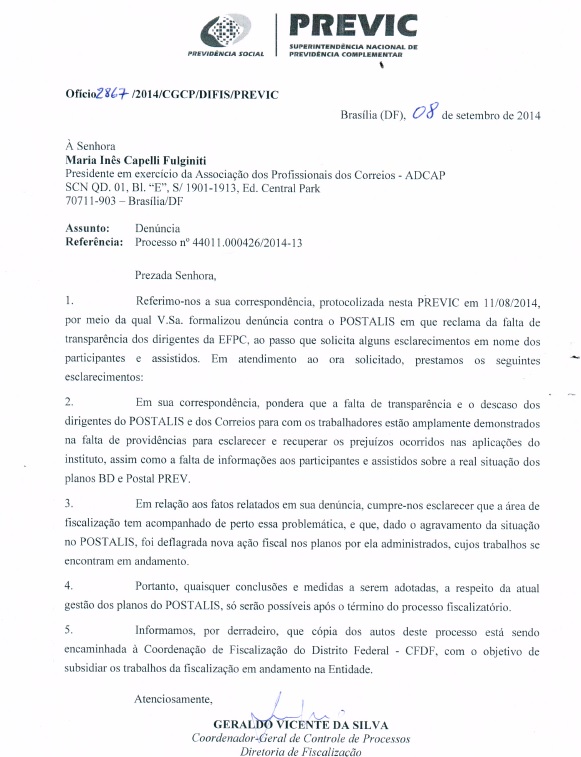 Permanece ainda pendente a resposta da PREVIC ao pedido de intervenção formulado conjuntamente pela ADCAP, FINDECT e ANAPOST no dia 20/08/2014.