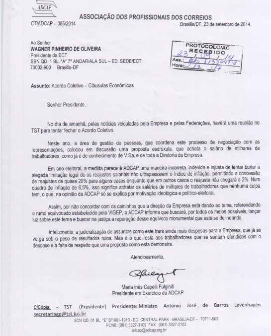A ADCAP encaminhou ontem ao Presidente a Carta 085, a seguir reproduzida, na qual ressalta seu inconformismo com a esdrúxula proposta de acordo apresentada pela VIGEP e referendada pela direção da Empresa.