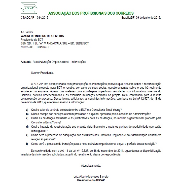 Sobre esse tema, informamos que encaminhamos para o Presidente da Empresa a carta abaixo transcrita, ainda sem resposta.