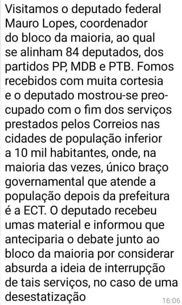 Visitamos o deputado federal do PDT, subtenente Gonzaga. Apresentarmos informações tocantes a importância social dos Correios, o deputado mostrou-se muito preocupado com a possibilidade de que o passivo social, atualmente, administrado pelos Correios seja devolvido à responsabilidade da União, uma vez que as empresas privadas não terão interesse em operar os serviços postais e Bancários em localidades onde o R/D seja negativo. deputado agendou na mesma data uma reunião com o presidente do seu partido para conversar a respeito do assunto e, após a leitura e discussão do material apresentado, antecipar o posicionamento do partido em relação à privatização.