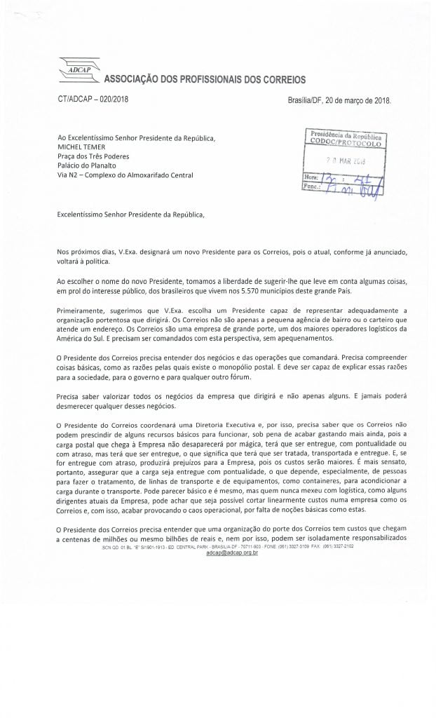 Para conhecimento, publicamos, abaixo, CT/ADCAP-020/2018 enviada ao Exmº. Sr. Presidente da República Michel Temer, cujo teor trata da importância da indicação de um profissional com a devida capacidade/conhecimento do negócio Correios para a condução da nossa Empresa, face a já anunciada saída do atual presidente Guilherme Campos para concorrer nas próximas eleições.