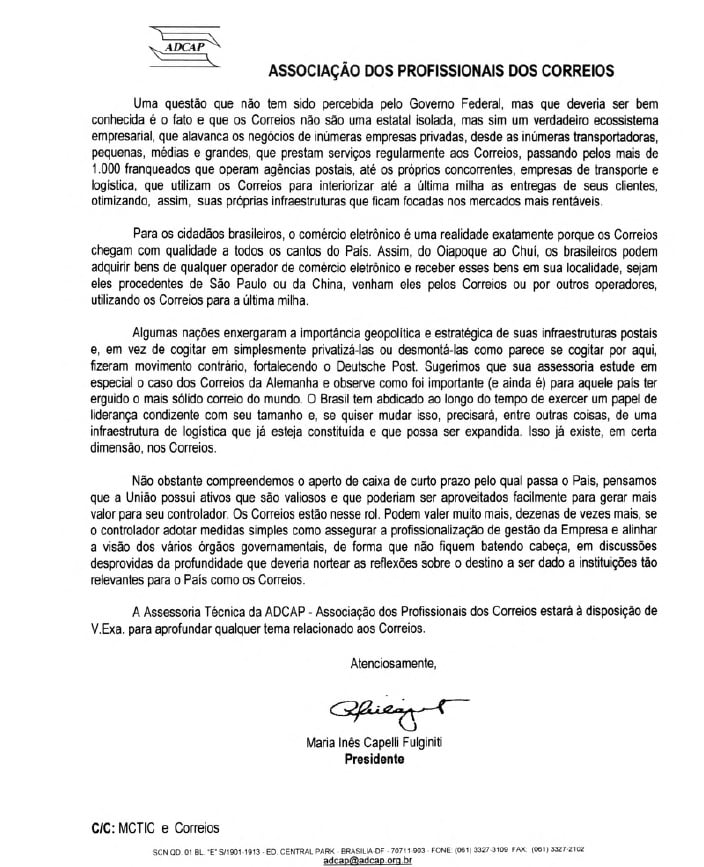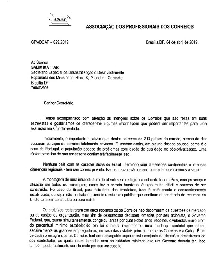 Em decorrência de o Secretário Especial de Desestatização e Desinvestimento vir citando os Correios em entrevistas que concede à imprensa, culminando com a veiculada na última edição da revista Veja sob o título “Estou frustrado”, a ADCAP protocolou hoje carta endereçada àquele Secretário, apresentando posicionamento da Associação.