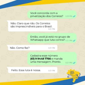 Os Correios são um patrimônio de todos os brasileiros, construído com o trabalho de muitos. Entregá-lo a estranhos e sem o compromisso com o país é impensável. Entre nessa luta. Fique por dentro de tudo através do nosso grupo de Whatsapp: http://bit.ly/WhatsCorreios Junte-se a nós!