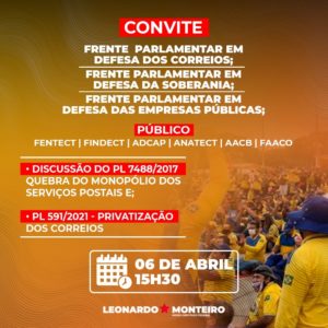 A ADCAP recebeu convite para participar de reunião com as frentes parlamentarem em defesa dos Correios, em defesa da soberania nacional e em defesa das empresas públicas. Caso a reunião seja transmitida publicamente, informaremos posteriormente o link de acesso.