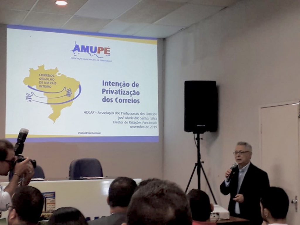 Estavam reunidos vários prefeitos de municípios pernambucanos e José Maria foi convidado a falar para todos. O diretor da ADCAP apresentou as razões contrárias à intenção de privatização dos Correios, explicou o que é monopólio postal e lembrou que os Correios não dependem do Tesouro Nacional e que a grande maioria dos municípios dependem dos insumos que chegam da região sudeste graças ao trabalho da estatal. Em menos de dez minutos, o recado foi dado e José Maria aproveitou também para falar sobre as cerca de 250 moções de repúdio já assinadas por prefeitos de cidades do Brasil inteiro.