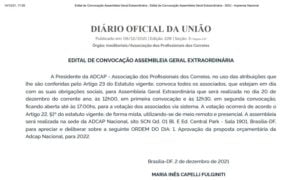 De acordo com o edital publicado no DOU, resumo abaixo, será realizada, hoje, dia 20/12/2021, a partir de meio dia (12h) Assembleia Geral Extraordinária, para a aprovação da proposta orçamentária da ADCAP Nacional para 2022.