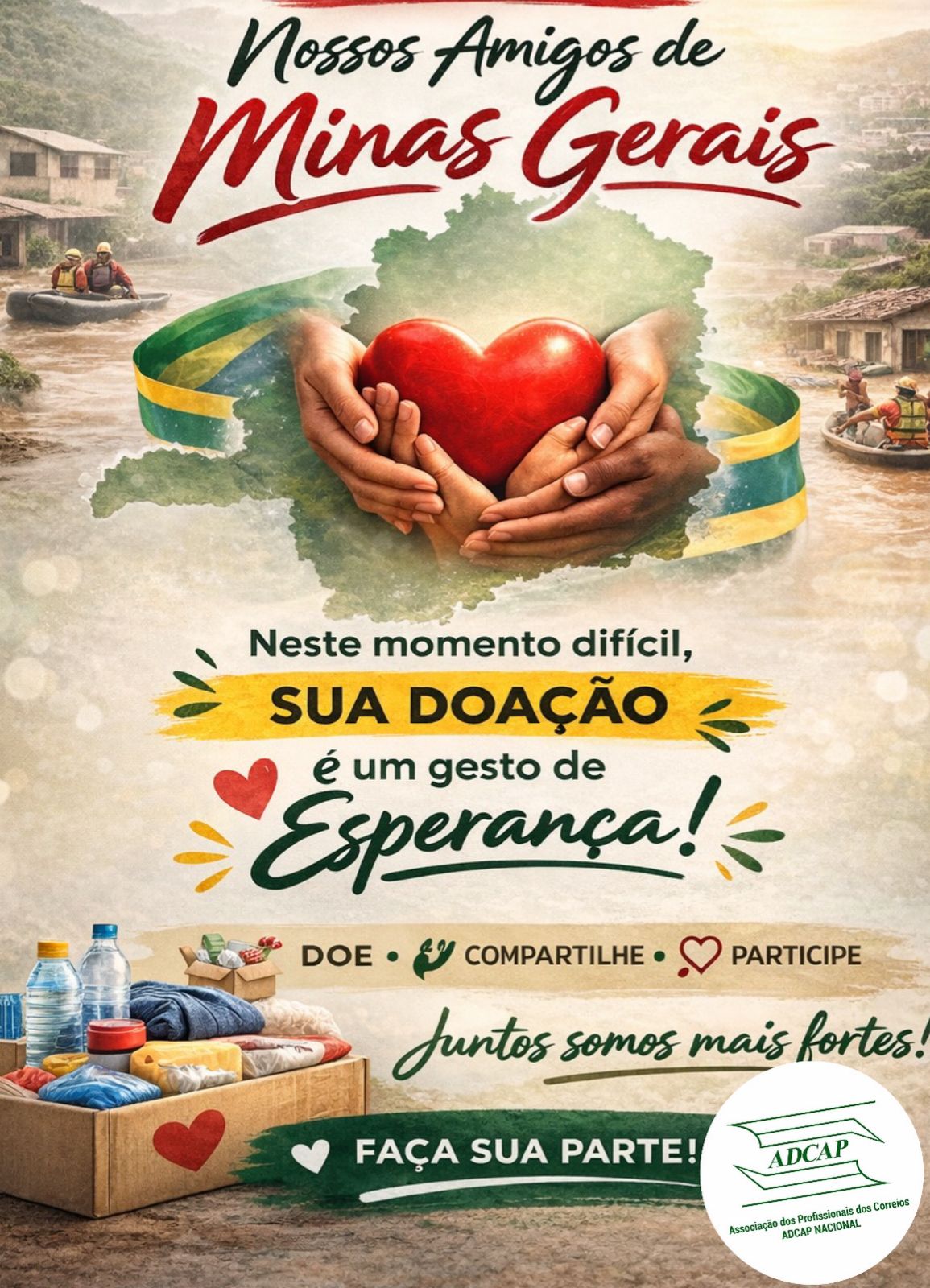 Diante deste cenário de destruição e tristeza, a ADCAP NACIONAL não poderia deixar de apelar aos associados do todo Brasil no sentido de minimizar o sofrimento dos nossos colegas e familiares, contribuindo para a campanha solidária chamada VAMOS AJUDAR OS AMIGOS DE MINAS GERAIS.