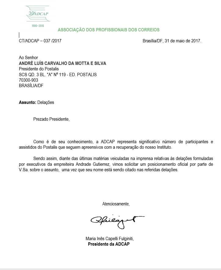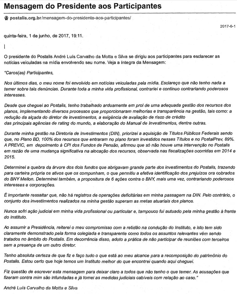 Divulgamos, para conhecimento,  resposta do Presidente do Postalis  a nossa carta enviada dia 31/05/17.