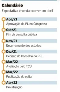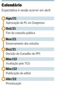 O calendário do BNDES prevê que a aprovação por deputados e senadores teria que ocorrer ainda em agosto para que a proposta seja modelada e submetida ao Conselho do Programa de Parcerias de Investimentos (PPI) em dezembro. O Tribunal de Contas da União (TCU) julgaria até março e o leilão ocorreria em abril. A principal definição no governo, e acolhida pelo relator, é vender 100% da empresa de uma vez, sem dividi-la nem manter ações.
