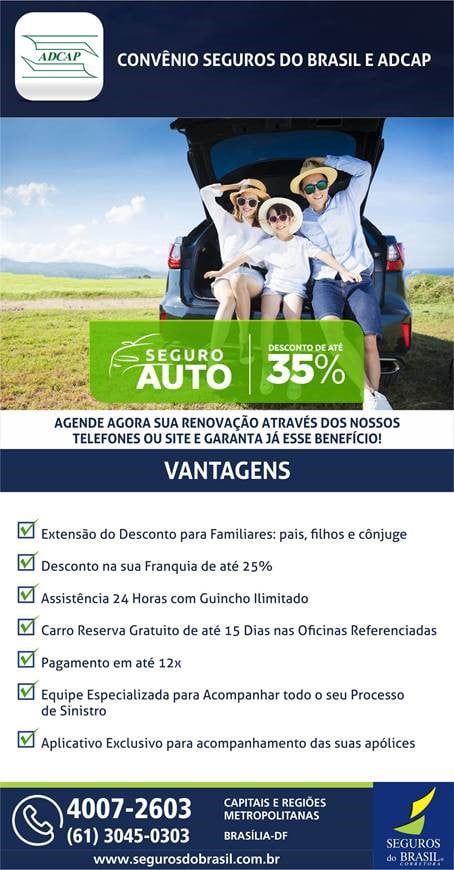 A ADCAP fez uma parceria com a corretora Seguros do Brasil e conseguiu uma apólice exclusiva para associados no seguro auto, com até 35% de desconto, em relação a outras seguradoras.
