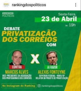 Nesta sexta-feira, às 19 horas, teremos um debate para mostrar as duas posições: tanto a defesa da manutenção da empresa como estatal, por parte do vice-presidente da Associação dos Profissionais dos Correios, Marcos Alves, quanto a defesa da privatização, por parte do relator da proposta na Câmara, deputado federal @alexisfonteyne30 (NOVO-SP).