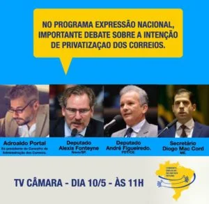 Em debate promovido pelo programa Expressão Nacional, da TV Câmara, na manhã desta segunda-feira, 10, o deputado federal Alexis Fonteyne (Novo-SP) e o secretário de Desestatização, Desinvestimento e Mercados do Ministério da Economia Diogo MacCord tiveram a oportunidade de expor suas razões para serem a favor da privatização dos Correios ao lado do também deputado federal André Figueiredo ((PDT-CE) e do ex-presidente do Conselho de Administração dos Correios Adroaldo Portal, estes dois contrários à intenção de privatizar a estatal.