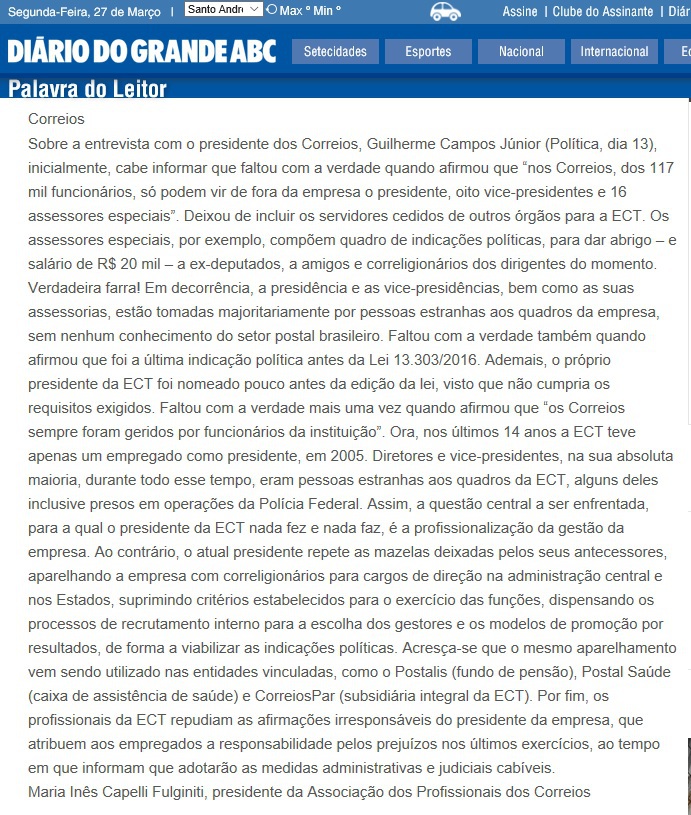 Direito de Resposta pela matéria veiculada no Jornal Grande ABC ‘Correios ainda estão na UTI, mas sem aparelho’