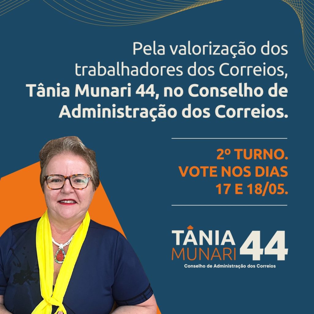 Nesse segundo turno das eleições, os ecetistas terão a oportunidade de reafirmar o resultado do primeiro turno e eleger Tânia Munari – 44, para ocupar uma posição no Conselho de Administração dos Correios. Com Tânia no Conselho, teremos lá uma líder capaz e comprometida com os interesses dos empregados e a sustentabilidade da Empresa.