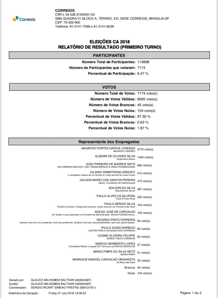 Divulgamos resultado do primeiro turno das eleições para o Conselho de Administração dos Correios.