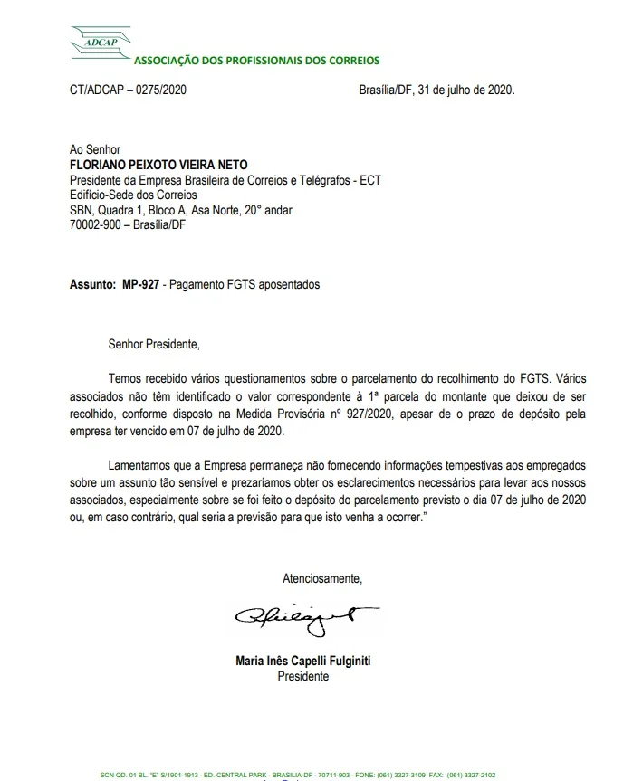 Diante do ocorrido, a ADCAP encaminhou à Presidência dos Correios carta com o seguinte teor: