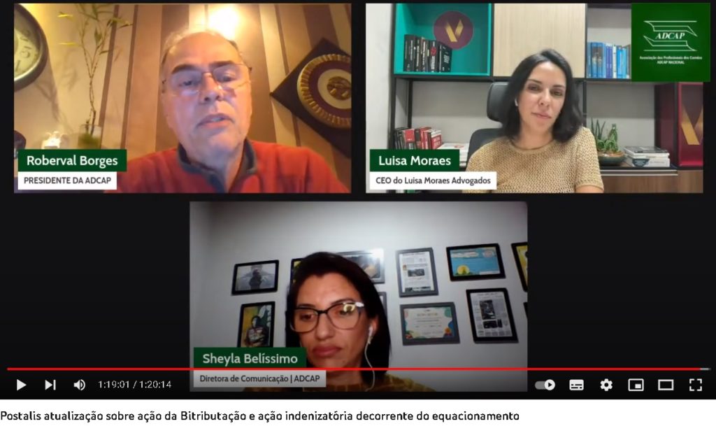 Postalis – atualização sobre ação da Bitributação e ação indenizatória decorrente do equacionamento foram os temas da live da ADCAP de ontem, 28/06. Com a participação da Dra. Luisa Moraes – especialista em Direito Previdenciário, a live teve a condução da diretora Sheyla Belíssimo e presença do presidente da ADCAP – Roberval Borges.