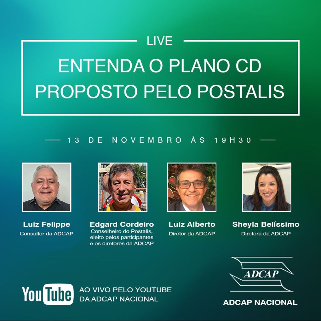 Live da ADCAP, HOJE, com o tema do momento: Plano CD proposto pelo Postalis. Participação de Luiz Felippe – consultor da ADCAP, Edgard Cordeiro – Conselheiro do Postalis, eleito pelos participantes e os diretores da ADCAP, Luiz Alberto E Sheyla Belíssimo.