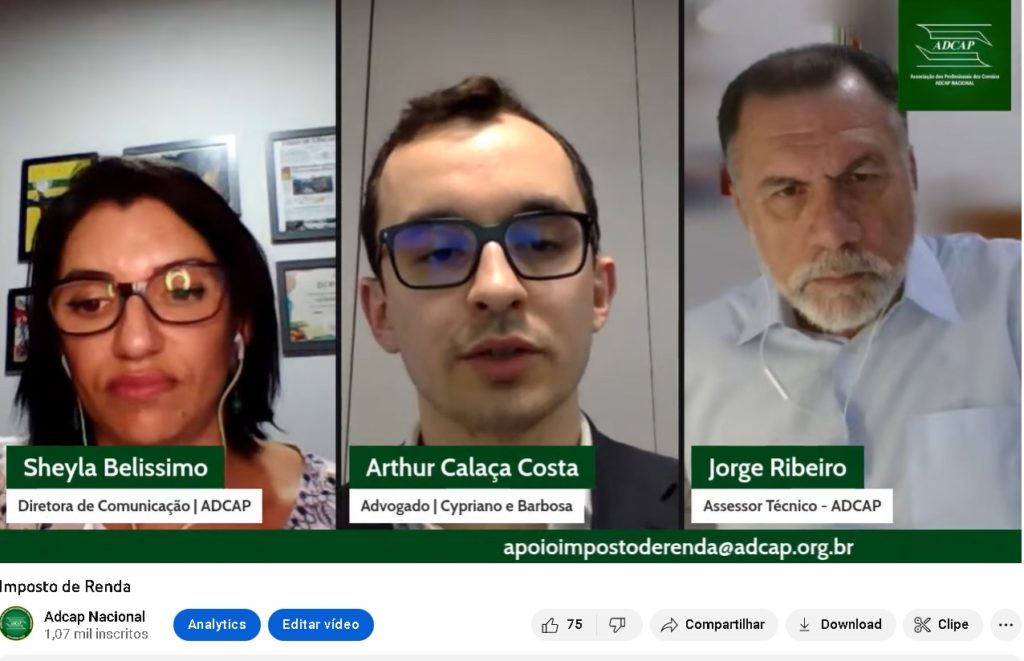 A ADCAP realizou ontem, 13/04, uma live para tratar e esclarecer diversos fatores sobre Imposto de Renda, além de informar sobre as ações movidas pela Associação sobre este tema. Com a mediação da Diretora Sheyla Belissimo, participaram como expositores o Dr. Arthur Calaça e Jorge Ribeiro – especialista em IRPF.