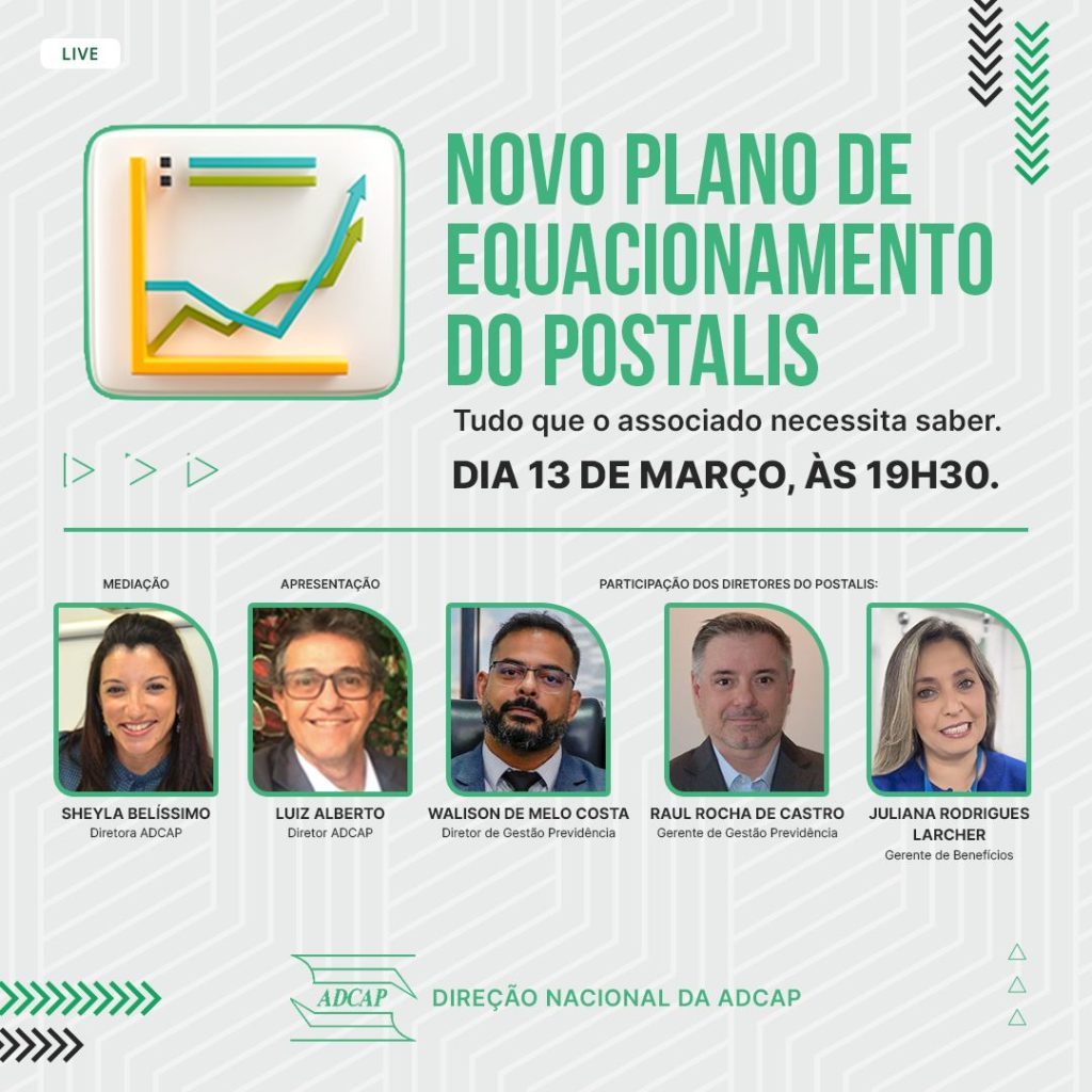 Com a mediação de Sheyla Belíssimo – Diretora da ADCAP e apresentação de Luiz Alberto – Diretor da ADCAP, a live contará com a participação dos diretores do Postalis: Walison de Melo Costa – Diretor de Gestão Previdência, Raul Rocha de Castro – Gerente de Gestão Previdência e Juliana Rodrigues Larcher – Gerente de Benefícios.