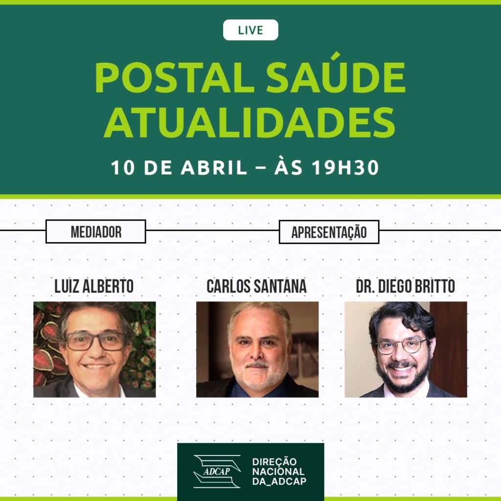 Postal Saúde – Atualidades é o tema da próxima live da ADCAP. Com mediação do Diretor Luiz Alberto, apresentação do Diretor Carlos Sant`Ana e o Advogado Dr. Diego Britto. Não perca a oportunidade de ficar informado sobre as atualizações do tema. Agende-se e participe!