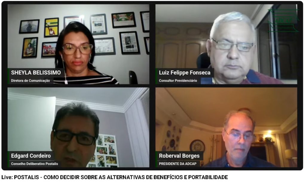 Na última live, ontem, 28 de maio, a ADCAP abordou o tema: Postalis – Como decidir sobre as alternativas de benefícios e portabilidade. Os convidados especialistas no assunto: Luiz Felippe – Consultor da ADCAP, Edgard Cordeiro – Conselheiro Deliberativo do Postalis, Roberval Borges – Presidente da ADCAP e Sheyla Belíssimo – Diretora da ADCAP participaram da live, puderam esclarecer e ajudar no entendimento dessas opções para a tomada de decisão.