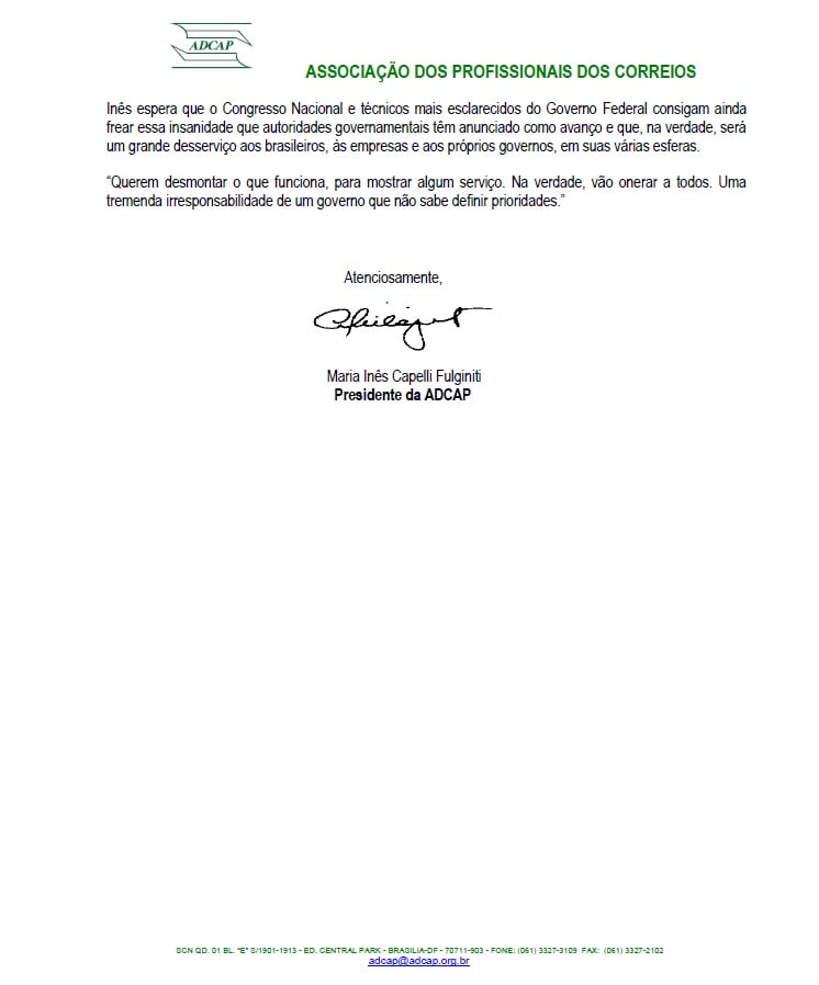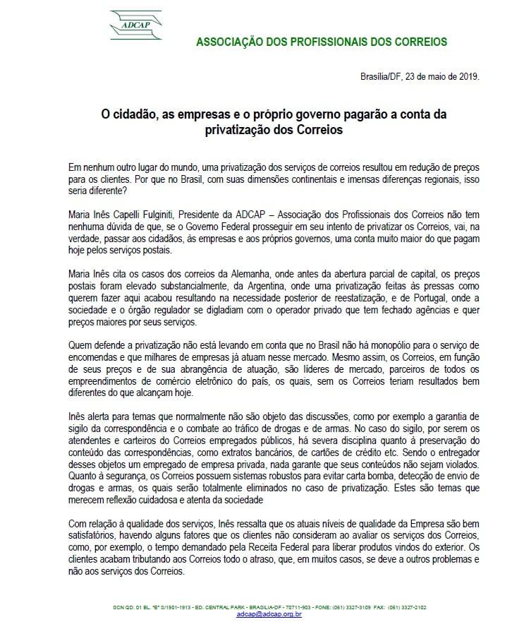 Diante da notícia de que novamente o Presidente da República teria mencionado, em reunião com jornalistas, a intenção de privatização dos Correios, a ADCAP Nacional encaminhou nesta data um release para a imprensa com o teor abaixo: