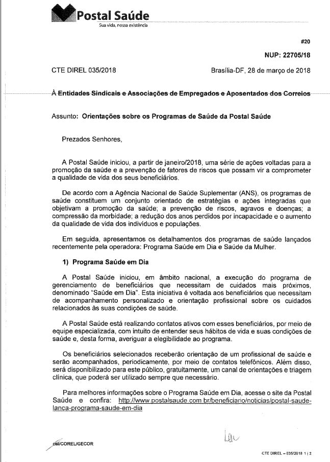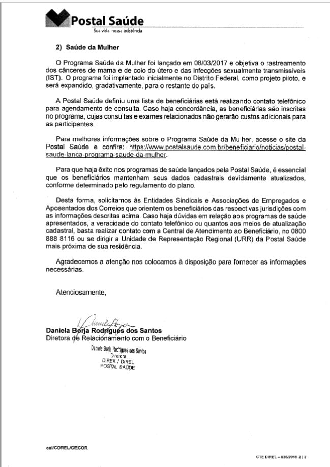 Recebemos da Postal Saúde a correspondência abaixo, que divulgamos, por ser de interesse de todos os associados beneficiários do plano de saúde, para conhecimento e providências.