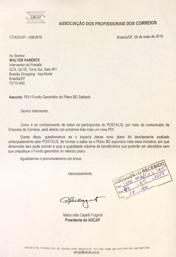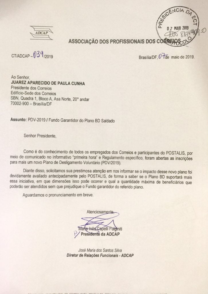 Considerando o Plano de Desligamento Voluntário proposto pelos Correios, a partir desse mês, a ADCAP encaminhou à Empresa e ao Postalis cartas indagando sobre os impactos que a adesão causará ao fundo garantidor do plano BD.