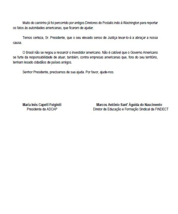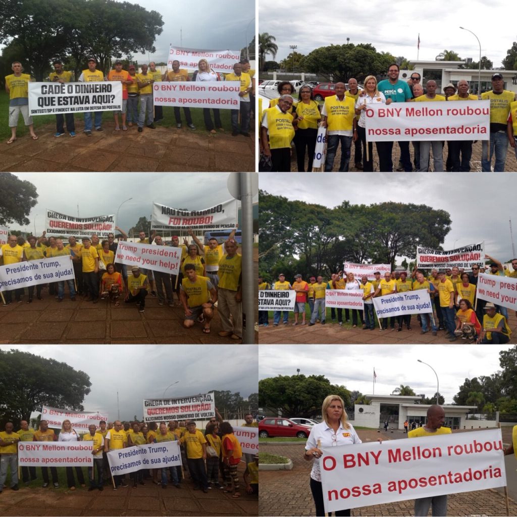 A Associação dos Profissionais dos Correios – ADCAP e a Federação Interestadual dos Sindicatos dos Trabalhadores (as) dos Correios – FINDECT entregaram, na Embaixada dos Estados Unidos, uma carta endereçada ao presidente Donald Trump, pedindo apoio para receber o dinheiro do POSTALIS, fundo de pensão dos empregados dos Correios, que estava sob responsabilidade do banco americano BNY Mellon e foi desviado, causando um rombo de R$ 10 bilhões de reais, que está sendo pago pelos participantes ativos, pensionistas e aposentados.