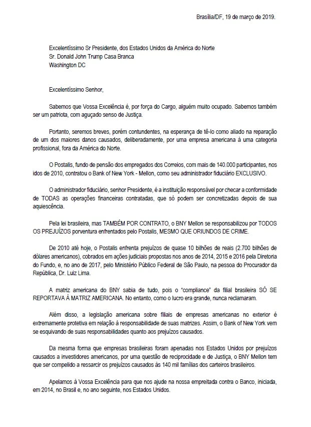 Na carta, as entidades pedem reciprocidade de tratamento pois, da mesma forma que empresas brasileiras foram obrigadas a ressarcir investidores americanos por prejuízos causados, o banco americano BNY Mellon tem a obrigação de ressarcir os investidores brasileiros (participantes do Postalis), pelos prejuízos dos investimentos feitos/geridos/administrados pelo banco.